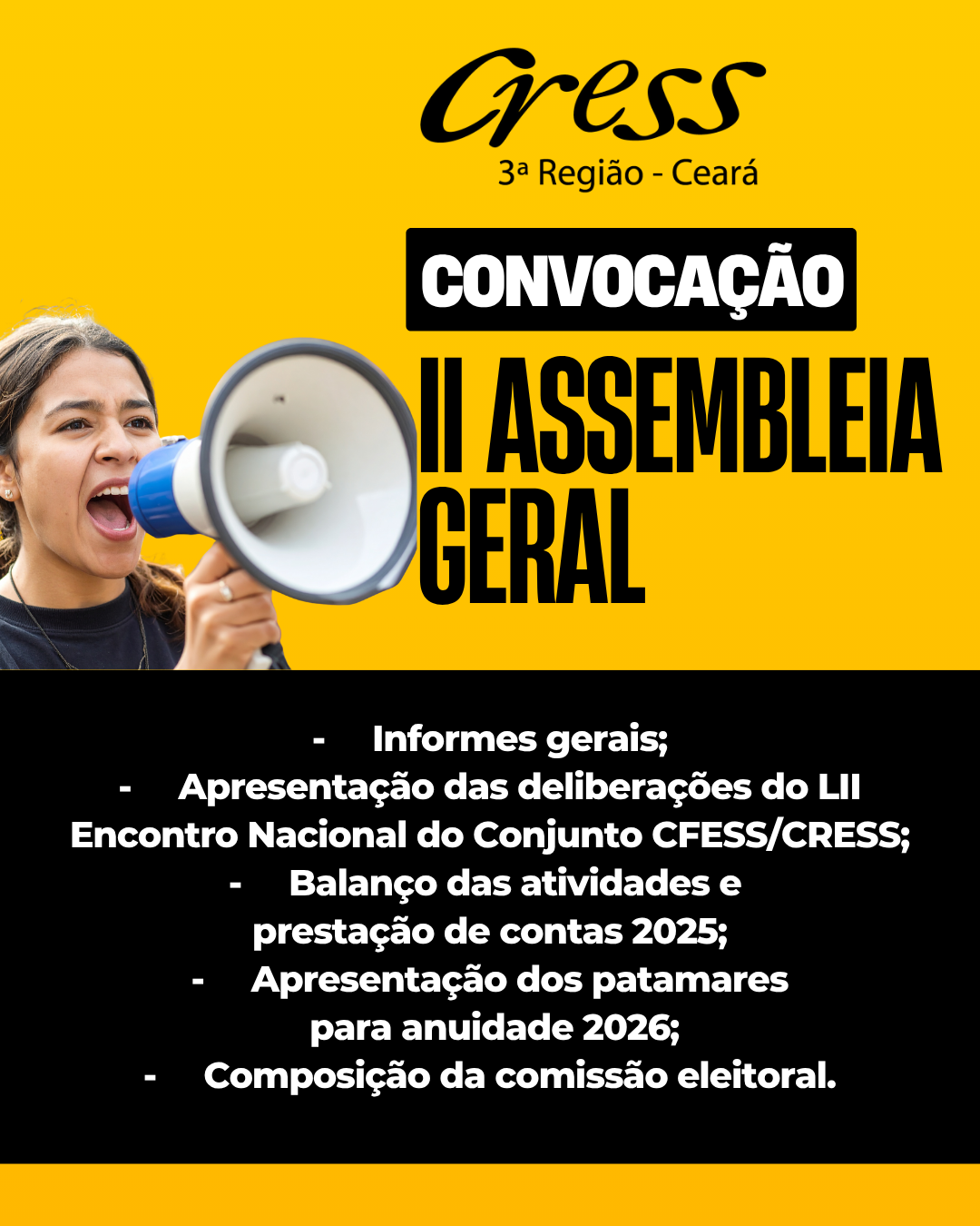 03 outubro 2025A Presidenta do Conselho Regional de Serviço Social – CRESS 3ª Região/CE, no uso das atribuições regimentais, vem convocar as (os) Assistentes Sociais para a II Assembleia Geral de 2025, que se realizará no dia 17 de outubro de 2025, no auditório do Conselho Regional de Serviço Social (CRESS – 3ª Região), Rua Waldery Uchôa, 90 – Benfica, Fortaleza-CE, às 17h, em primeira chamada, e às 17h30, em segunda chamada com a seguinte pauta: