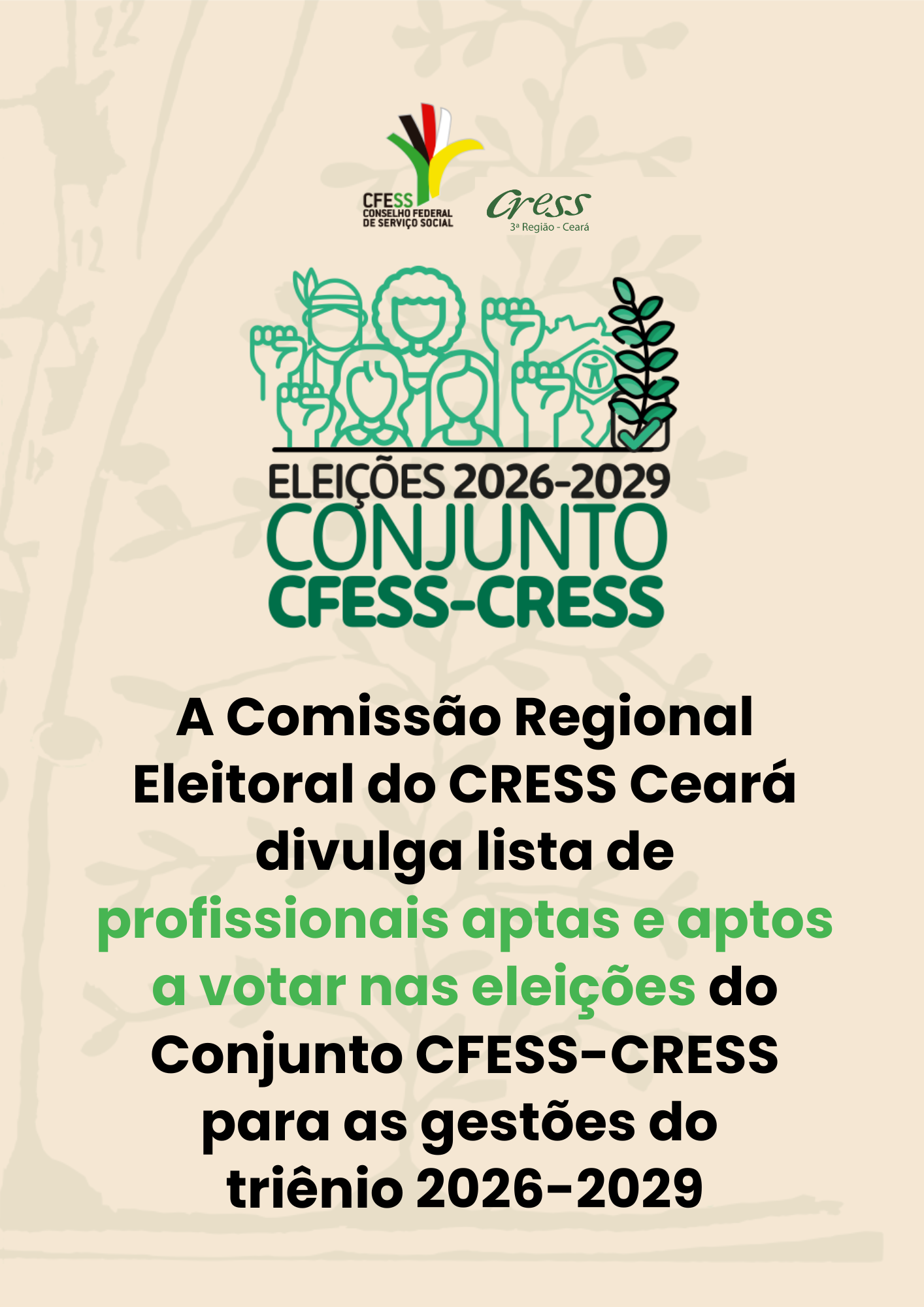 16 janeiro 2026A Comissão Eleitoral Regional (CRE) do CRESS Ceará divulga a 1ª lista de profissionais aptas e aptos a votar nas eleições do Conjunto CFESS/CRESS para as gestões do próximo triênio 2026-2029. Esta lista será atualizada periodicamente, até o dia 2 de março, e pode ter a inclusão de registros válidos a participar do pleito. Ao todo, 5.827 assistentes sociais fazem parte desta primeira listagem.