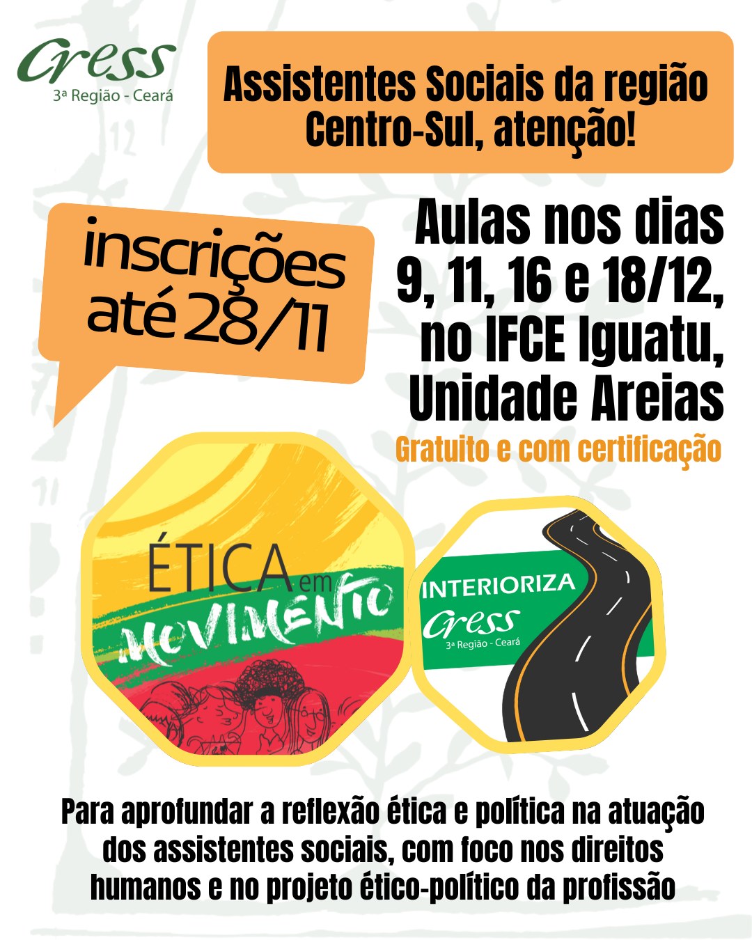 24 novembro 2025O CRESS Ceará realiza, por meio do Interioriza CRESS, o curso Ética em Movimento na Região Centro-Sul do estado, nos dias 09, 11, 16 e 18 de dezembro, de 8h às 6h na Unidade Areias do IFCE, em Iguatu. O objetivo da formação é aprofundar a reflexão ética e política na atuação dos assistentes sociais, com foco nos direitos humanos e no projeto ético-político da profissão.